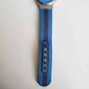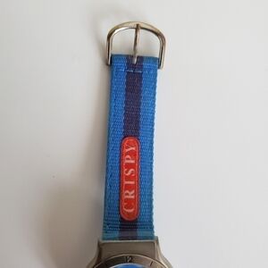 1999 Vintage M&M's Crispy Watch Blue Striped Buckle Band Round Face Silver Tone