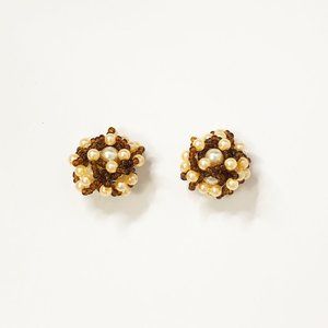 These handcrafted bead clip earrings alternates between 2 colors (silk champagne and brown) and 3 bead sizes (2 faux-pearls), has a flower structure that swirls around a big silk champagne color pearl, and is supported by a metallic clip. It takes me 2-3 hours to carefully place each bead in place and build this ascending beauty bead by bead. They are not perfectly symmetrical, as all things hand-made.