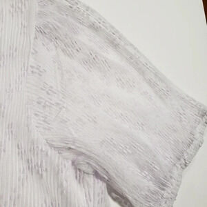 Cleo petites white top with lace overlay short puff sleeves,round neck line with ruffle hem.