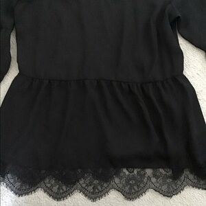 “Cold-shoulder” top with spaghetti straps and beautiful lace-like detailing on the bottom and sleeves. Pretty bell sleeve detail as well. In excellent condition.