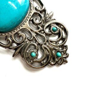 1pc Vintage filigree buckle faux turquoise accents. Gunmetal finish. 5 x 2.75