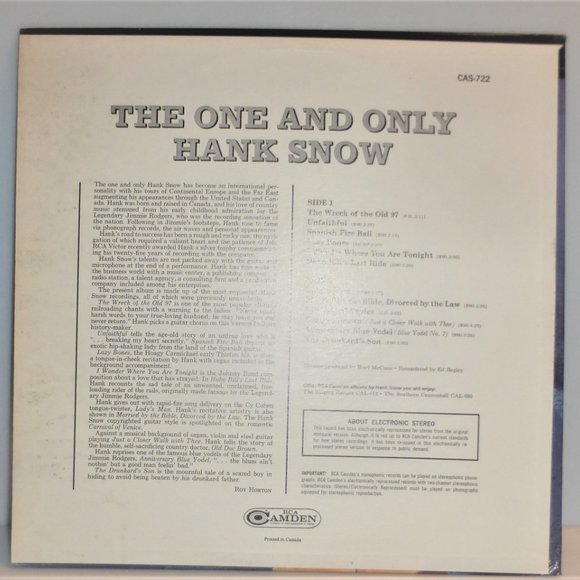 1st Press The One And Only HANK SNOW Vinyl LP Record Camde RCA #CAS722
