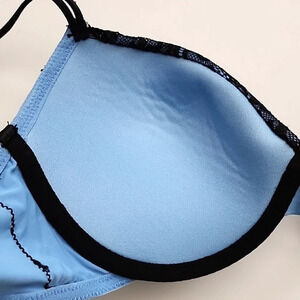 Excellent pre-owned condition, Rose + Vine underwire bra in blue with a pretty black lace detailing with padded cups, size 34D / 36C.