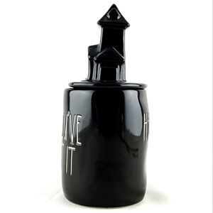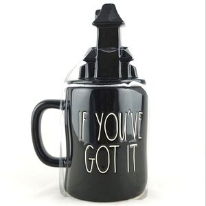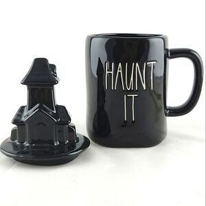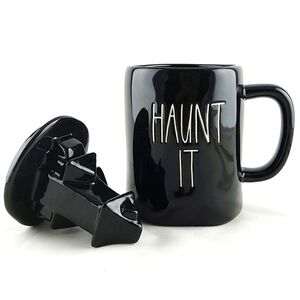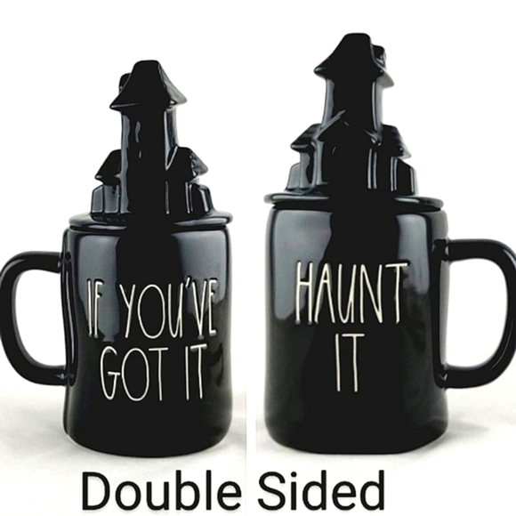 NEW Rae Dunn Artisan Collection by Magenta mug in glossy black with fun white large letters HAUNT IT etched on one side & IF YOU'VE GOT IT on the other and matching topper in the form of a haunted house to keep your brew hot!