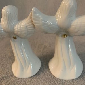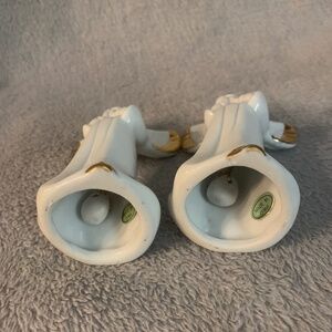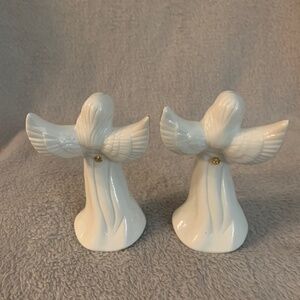 2 Heavenly Angel ceramic bells. White with gold accents. Made by Giftco. 4 inches tall. Gold knots on the back of dresses are the knotted ends of the gold strings holding the bell ringers inside the bells. Shown in photos.