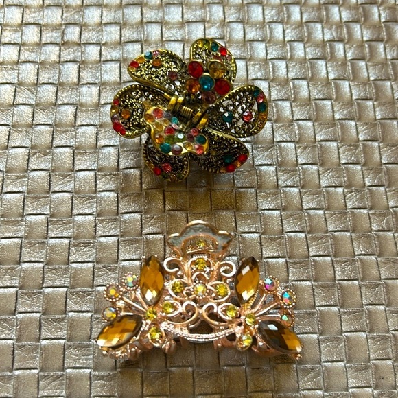 One is a floral dark gold tone hair clip. Metal with rhinestones and filigree metal. 1.5”. The other is light gold tone metal with rhinestones. 2.5”. New, never used.