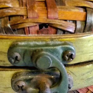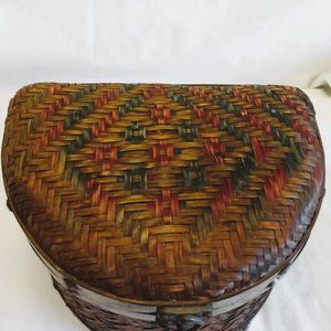Set of Two Bamboo Company, Nesting Half Moon Wicker Chests. Both are Dark Brown Wicker With Some Red & Green Painted Pieces Weaved Through Them. Accented With Brushed Brass Trimming & Hardware. Smaller One Fits Inside Large One Nicely. Large Chest Looks Like It Has A Blob of Glue on Inside. Small Chest Looks Like A Tiny Piece Of Wicker Has Broken Off Of Front. Some Light Ware Along Edge From When Chests Are Closed. First Set Of Pics Are The Large Chest. Last Set Are Of The Small One. Large Chest app. 5.25" x 9"-Inside Depth 4.25"...Small Chest app. 4.5" x 7.5"-Inside Depth 3.75". Chests Are In Pre-Owned Condition.