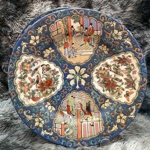 Beautiful vintage plates featuring intricate floral and scenic designs. Rich blue background with colorful details.