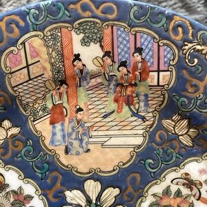Beautiful vintage plates featuring intricate floral and scenic designs. Rich blue background with colorful details.
