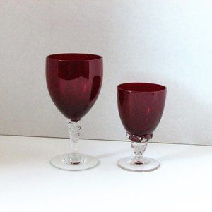 2 Different Vintage Ruby Red Goblets Clear Fancy Stem Small Elegant Wine Glasses