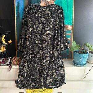 Step out in style with this chic long sleeve dress featuring a captivating black and gold floral design. Perfect for any occasion, this dress combines elegance with comfort.