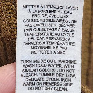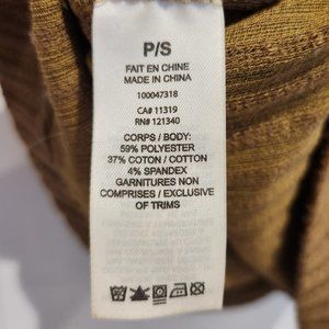 Very comfortable, soft ribbed knit in size small. Colour is a lovely unique gold with an olive greenish tint to it!