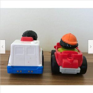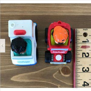 Set of 2 Fisher-Price Little People vehicles includes 1 ambulance (2 3/4" long) and 1 red race car (2 5/8" long). Pre-owned "played with" condition, marks/paint rubs/scuffs to plastic surface. Wheels are in good working condition.