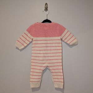 Pink and cream striped knit romper with button gusset and two front pockets. Buttons at shoulder.