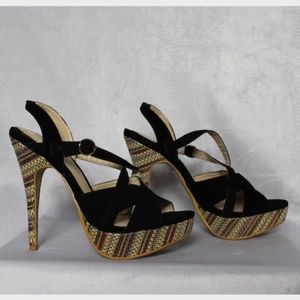 Soft velvet-like black upper, multicolour woven heels and soles with gold buckles.