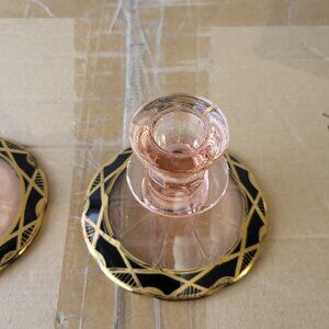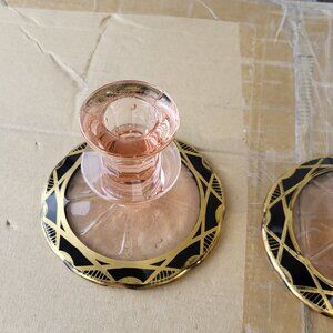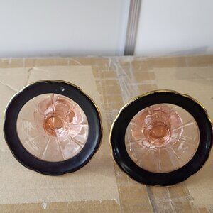 2 Lovely Pink Depression Glass Candle Holders Black design base GUC "BIN I"