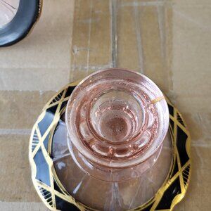 These lovely pink depression glass candle holders have a black designed base, adding a touch of elegance to any room. Made in the United States in the late 20th century, these vintage candle holders are suitable for taper/dinner candles and are of unmarked brand. The glossy finish and etched details give off a great depression style, perfect for adding a nostalgic touch to your decor.
