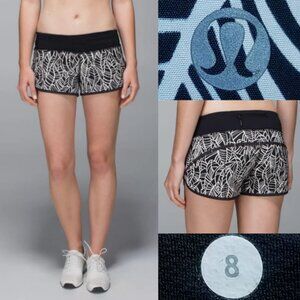 -Lululemon Run Speed Short 2-Way Stretch Pretty Palm Black Angel Wing shorts size 8 medium. 32 inch waist. 9 inch from top to bottom. 3.5 inch inseam.