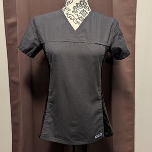 Both size XXS on the tag but fits like a form-fitting XS because it stretches on either side. They have a full width hidden pocket (like a hoodie) and two pen pockets on the shoulder. In good shape. This is the correct shade of blue if you work at LifeLabs!