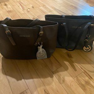 2 Michael Kors jet set travel totes. The brown one is brand new, still has plastic on it. The black one is in excellent condition, however it is missing the zipper pull tab. It is easy to swap the pull tab between each purse.