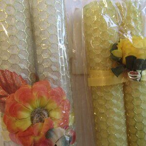 2 Pair, 6" Bees Wax Candles, Decorated, Yellow w/ Gold Glitter, Hand rolled...