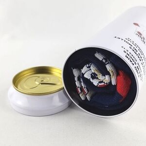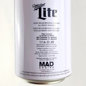New with tags, Miller Lite 2 Pairs of crew socks rolled into a fun collectible beer tin, multi-coloured blue, red, white, shoe size 8-12.