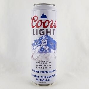 New with tags, Coors Lite 2 Pairs of crew socks rolled into a fun collectible beer tin, multi-coloured black, red, white, shoe size 8-12.