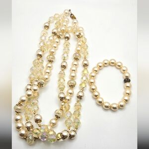 2 Piece Pearls Lot Layered Necklace Stretch Bracelet Faux Crystals