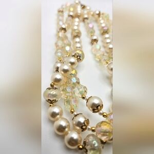 The 3 strand layered necklace is approximately 18 inches long and made of lightweight acrylic (faux)