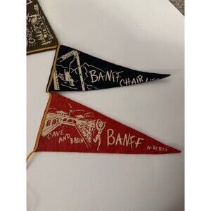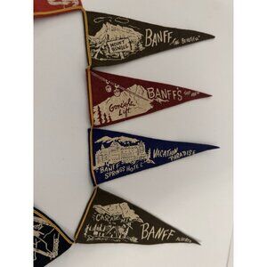 Crafted to appeal to collectors and enthusiasts alike, these two rare vintage Banff pennants celebrate the iconic landmarks and attractions that make Canada's natural beauty a cherished treasure. Each pennant is a string of memorable imagery, capturing the essence of Banff's breathtaking landscapes and historical charm.