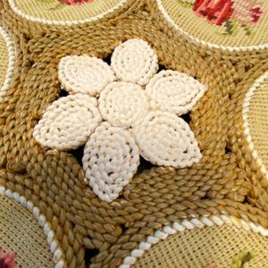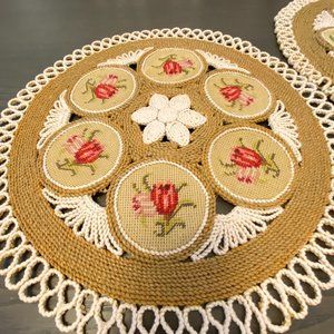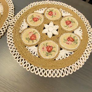 2 RARE Large Vintage Eclectic Round Handwoven Raffia Placemats Hot Pad Floral