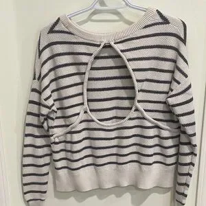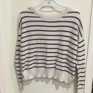 Stay cozy and stylish with this striped cream and black sweater. Perfect for any casual outing.