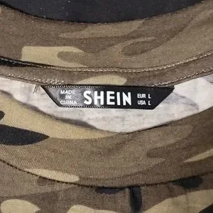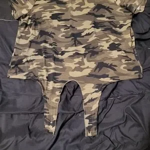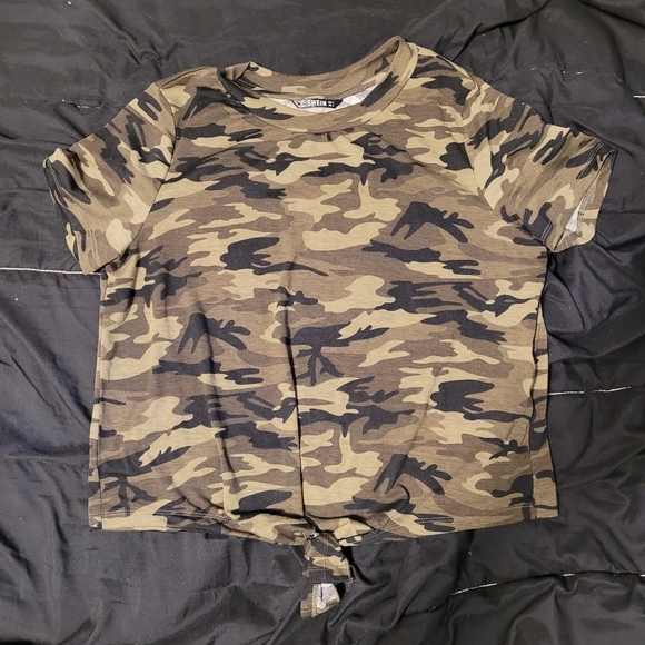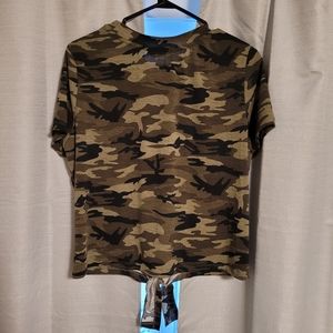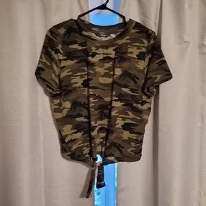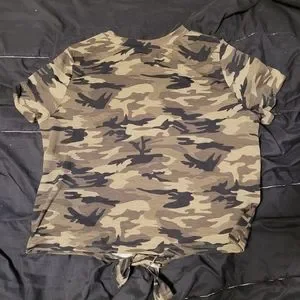Camo patterned tie crop top. Size large, knot on bottom - can untie and adjust. Not see through, cotton material.