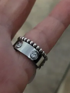 The bubble ring is sterling silver, the one with crystals is stainless steel