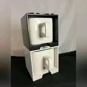 2-Stackable Cube ceramic Mugs/ with holder. Stackable box holder, made by Gattola. Measures 3.5” long x 3.5” wide. Lego system for attaching more.