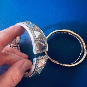 Gorgeous pair of hinged cuff bracelets - perfect for stacking or wearing solo! One features stunning geometric inlay design, the other is a sleek polished gold-tone classic. Mix metals for a trendy look!