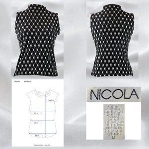 Made in the USA NICOLA Sleeveless Black & Silver Top in Size Medium has a high neck and is in very good condition with no flaws. Measurements in photos - note measurements taken flat and unstretched. Waist, Hip and armpit to armpit (chest) is then doubled.