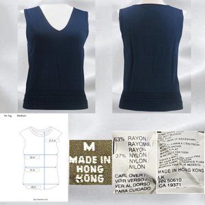 Blue Sleeveless V Neck Top in Size Medium. Has a beautiful detail trim on the bottom and is in very good condition with no flaws. Missing label tag. Measurements in photos - note measurements taken flat and unstretched. Waist, Hip and armpit to armpit (chest) is then doubled.