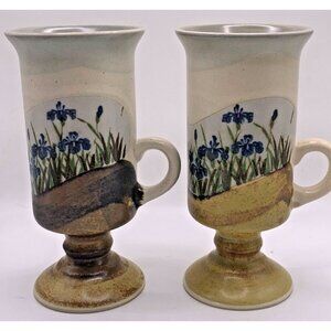 2 VTG Otagiri Tall Irish Coffee Mugs Footed with Blue/Purple Irises Stoneware