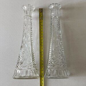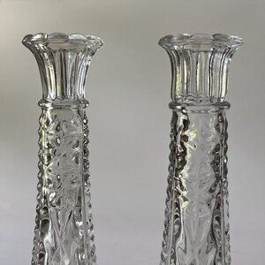 2 Vintage Anchor Hocking Clear Glass Bud Vases Stars Bars Starburst 9"