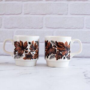 Set of two vintage Biltons mugs, crafted from classic English ironstone in Staffordshire, England. These sturdy ceramic mugs feature an earthy pattern of rich brown and deep rust leaves, accented by fern-like foliage—a perfect touch of cozy vintage charm for your kitchen or fall decor.