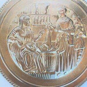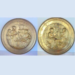 2 Vintage Embossed Brass Wall Plate Plaque of 16th Century Maids Preparing Meals