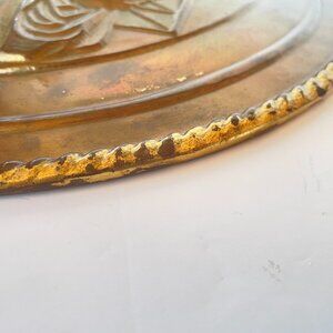 These decorative wall plates feature raised designs and a warm vintage patina, giving them a rustic, timeworn character. The surface shows areas where the original coating has naturally worn, revealing a rich gold tone beneath – a unique finish that only age can create.