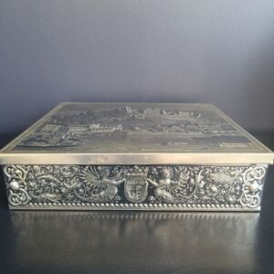 2 Vintage Embossed Tin Boxes - Rembrandt, Old World Castle, Europe, Musketeers