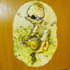 2 Vintage Handmade 3D Doll Cut Outs Layered on Wooden Plaques 1975