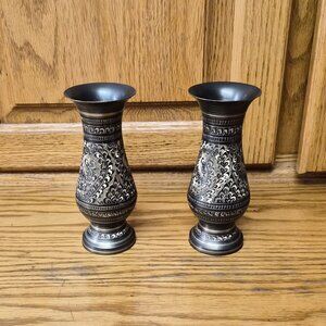2 Vintage Indian Brass Bud Vases – Hand-Etched Floral Pair, 5.75” Boho Eclectic