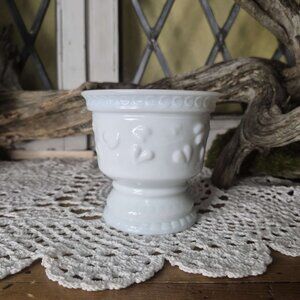 Set of two vintage milk glass footed planters, with squares and vines embossed designs. This could be used as a vase, plant pot or trinket dish. The bigger one is Randall barnd. The smaller one could also be a pillar candle holder ; turn it over to hold a tea light candle.
