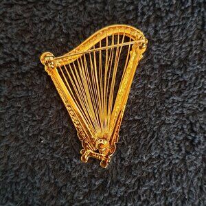 This stunning vintage Monet harp brooch features a radiant gold-tone finish and is adorned with sparkling white rhinestones. It beautifully captures the elegance of a classical harp in miniature form.