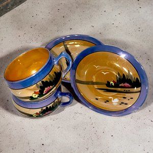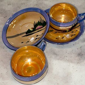 2 Vintage RS Japan 1950s Peach and Blue Lustreware Cups and Saucers