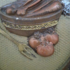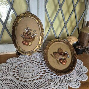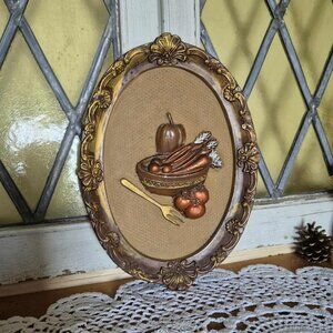 Vintage mid-century set of two oval chalkware still life wall hangings. Possibly a genuine peice of Girotti Sculptured Art (no sticker, seal, or signature). These three-dimensional castings of dark brown antique frames embellished with gold feature vegetables in a bowl and a kitchen utensil, witch are enhanced with gold and copper metallic paint. Perfect for adding a cottage core touch to your Fairy kitchen!